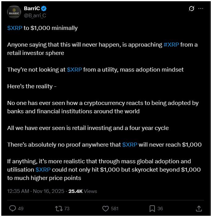Egy X-en megosztott bejegyzésben Barri C kiemeli, hogy az 1000 dolláros XRP-vel kapcsolatos kételyek a kisbefektetői gondolkodásból erednek.