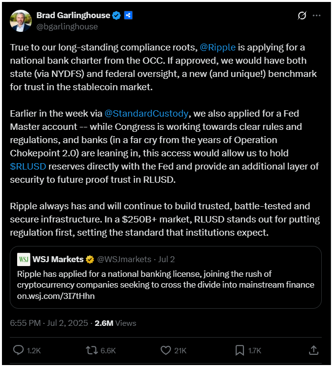 Szerinte az XRP értékelése kizárólag a lakossági befektetők és a négyéves ciklusok szemszögéből figyelmen kívül hagyja az intézményi elfogadás és a valós felhasználás példátlan helyzetét.