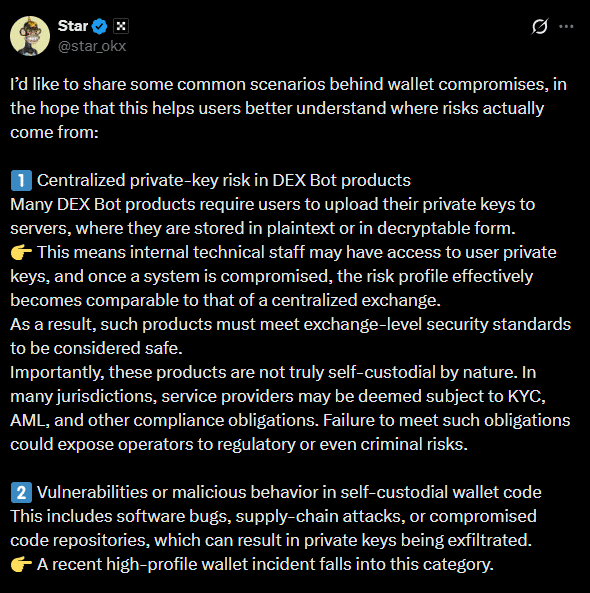 A kriptós hackek számának növekedésére reagálva az OKX vezérigazgatója és alapítója, Star Xu kiemelte a DEX botokat és a letétkezelő pénztárcákat mint új kockázati tényezőket és célpontokat.