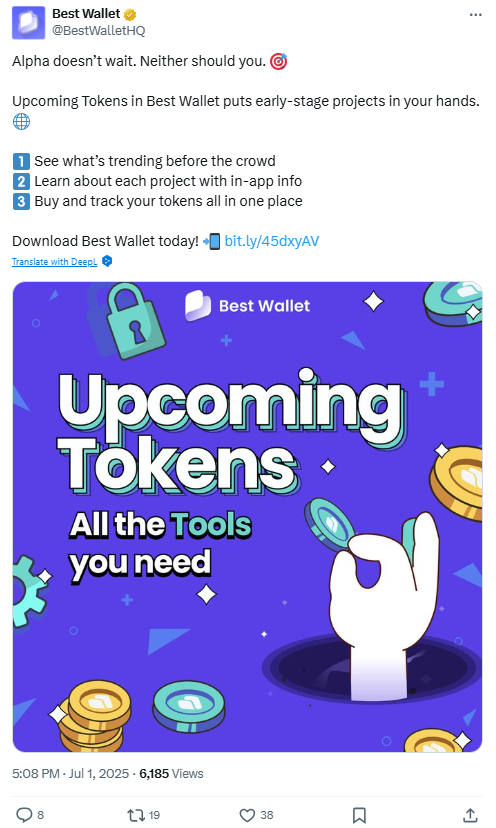 Végül ejtsünk szót egy kulcsfontosságú funkcióról, ami megmagyarázza, miért lett a Best Wallet az egyik legnépszerűbb Web3 alkalmazás, több mint 500.000 regisztrált felhasználóval, akiknek 50%-a havonta aktív. Sikerének fő oka az Upcoming Tokens funkció.