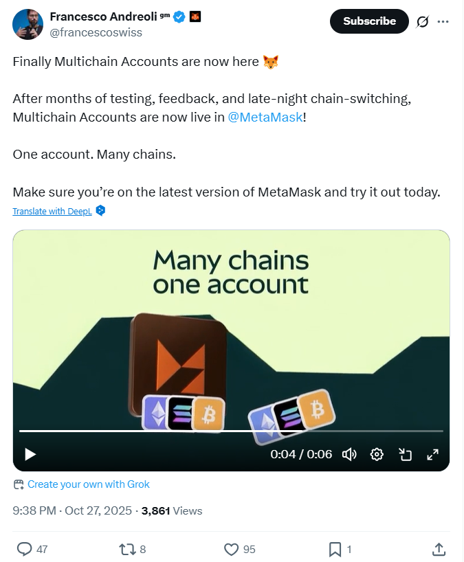 Nemrég bevezette a multichain fiókokat, így a felhasználók már kezelhetik az EVM és a nem-EVM címeket is, ideértve az Ethereumot, a Solanát, és hamarosan már a Bitcoint is.