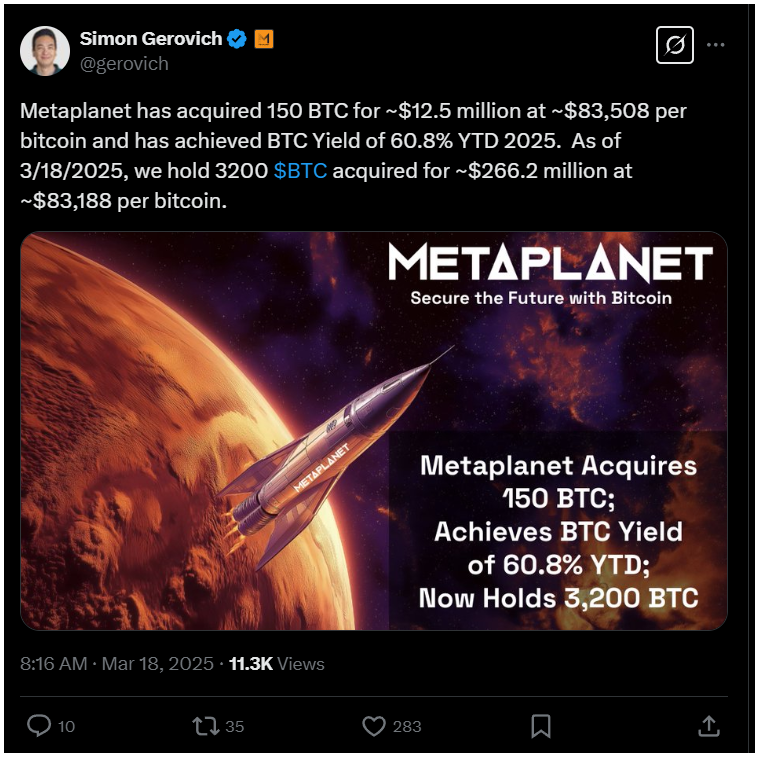 A vállalat vezérigazgatója, Simon Gerovich elmondása szerint a Metaplanet körülbelül 12,5 millió dollárt fordítottak a vásárlásra, átlagosan 83.508 dolláros BTC árfolyamon.
