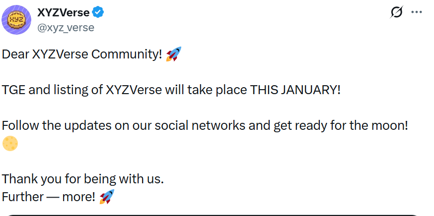 2026 január 29-én a MEXC elindítja az XYZ/USDT kereskedési párt 13:00 UTC-kor, amellyel hivatalosan is megtörténik az XYZVerse XYZ tokenjének első tőzsdei listázása.
