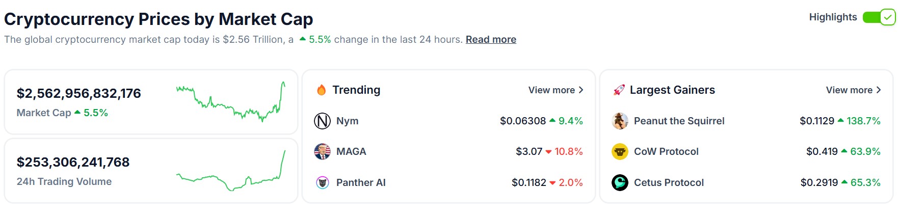 A Bitcoin megereszkedésének példáját egy ideig a szélesebb piac is követte. Most viszont kriptovaluták teljes piaci kapitalizációja az elmúlt egy nap során emelkedett, és jelenleg 2,56 billió dollárt kóstál.