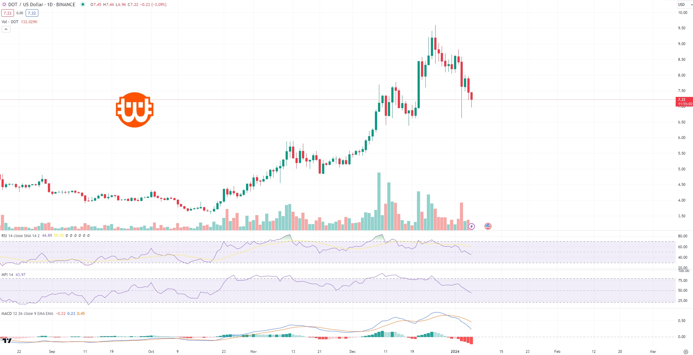 A DOT napi grafikonjára vetett pillantásunkból kiderült, hogy a MACD medvésbe fordult.