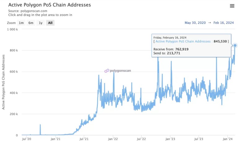 A Polygon (MATIC) napi aktív címei új, minden idők legmagasabb értékére (ATH) szöktek, mivel a proof-of-stake (PoS) láncban 2024-ben továbbra is nagyobb a felhasználói részvétel.