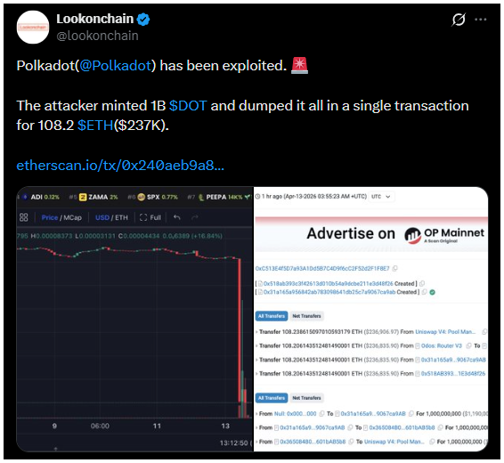 Április 13-án egy támadó 1 milliárd DOT tokent hozott létrel az Ethereumon, majd az egészet egyetlen tranzakcióban eladta, nagyjából 108,2 ETH-ért, vagyis körülbelül 237.000 dollárért.