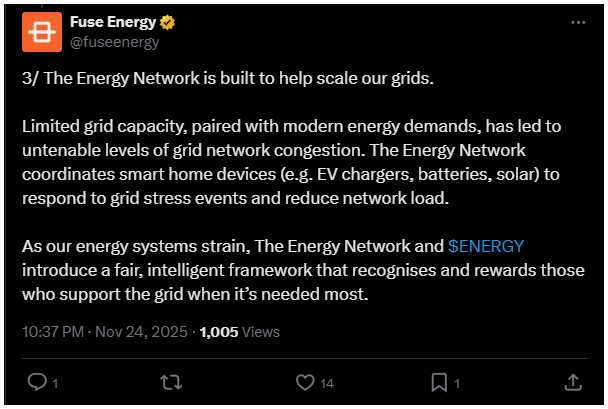„Az Energy Network a hálózataink bővítését támogatja… Ahogy energiarendszereink egyre nagyobb terhelés alá kerülnek, az Energy Network és az $ENERGY egy olyan igazságos, intelligens modellt vezet be, amely jutalmazza azokat, akik a legnagyobb igény idején segítik a hálózatot.”