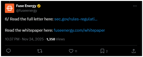 A döntés oka, hogy a Fuse Energy natív tokenje, az ENERGY nem ütközik a SEC értékpapírjogi követelményeibe.