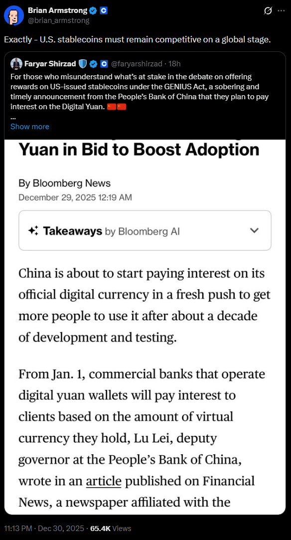 Az ok egyszerű: Kína bejelentette, hogy 2026-tól hozamot fizet a digitális jüanra, ezzel aktívan ösztönözve annak használatát.