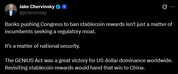 Ekkor vált a kérdés geopolitikává. Jake Chervinsky, a Variant Fund jogi vezetője szerint a stablecoin-hozam elvágása már nem a bankok védelméről szólna, hanem az amerikai dollár globális szerepének gyengítéséről.