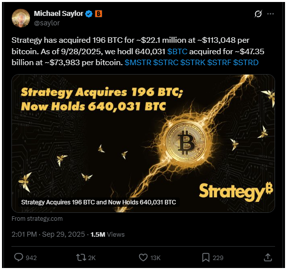 A szeptember 22. és 28. közötti vásárlást a cég részvényértékesítésből finanszírozta, STRF, STRD és MSTR papírokat adtak el úgynevezett „at-the-market” ügyletekben, amit leegyszerűsítve úgy is mondhatunk, hogy részvényt cseréltek Bitcoinra.