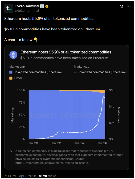 5,1 milliárd dollár tokenizált árucikk, és szinte az összes az Ethereumon van