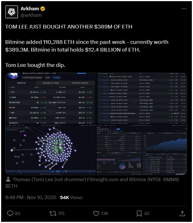 A Bitmine az elmúlt hét napban 110.288 ETH-ot vásárolt, átlagosan 3530 dolláros árfolyamon.