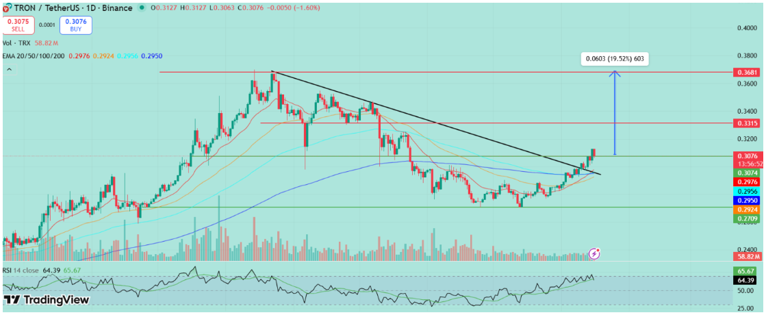 Amennyiben ez megtörténik, a technikai kép alapján akár egy 20 százalékos további emelkedés is megnyílhat, amely a 0,368 dolláros tartomány felé tolhatja a TRX árát.