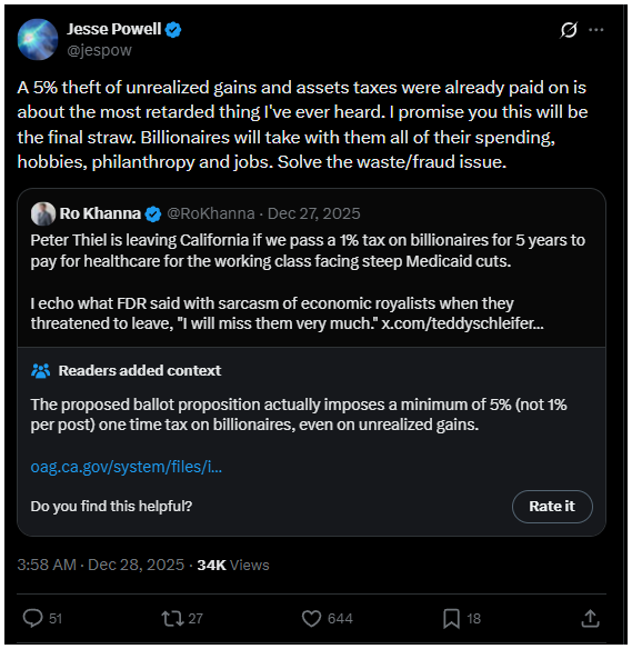 „Miért van szüksége Kaliforniának vagyonadóra? Hogy fedezze a hatalmas csalásokat. A vörös államok, mint Texas és Florida, még jövedelemadót sem szednek. A demokraták mindent ellopnak, majd a munkahelyteremtőket hibáztatják a »kapzsiságukért«.”