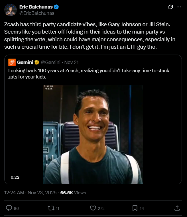 Balchunas szerint a Zcash most úgy viselkedik, „mint egy harmadik párt jelöltje” az amerikai választásokon: látványos hype, de közben megosztja a szavazatokat.