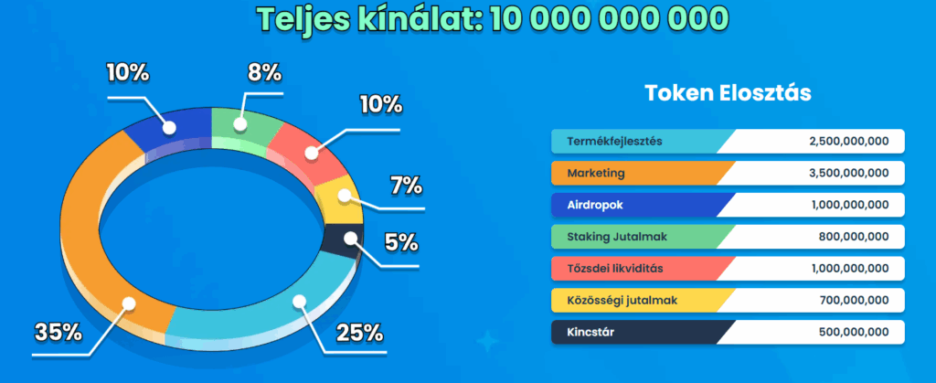 A tokenomika egyszerű és átlátható: a teljes 10 milliárdos kínálatból 25% fejlesztésre, 35% marketingre, 8% lekötési jutalmakra megy, a többi pedig airdropokra, likviditásra, közösségi ösztönzőkre és a kincstárra. Ez a struktúra a növekedést és a felhasználói bázis bővítését helyezi előtérbe.