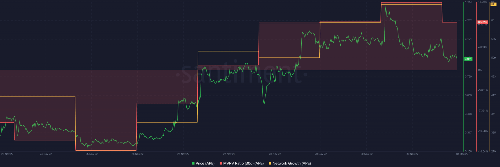 Mindazonáltal az APE on-chain mutatói kedvezőek voltak, és azt sugallta, hogy a befektetőknek nem szabad pánikba esniük a jelenlegi piaci helyzetben.