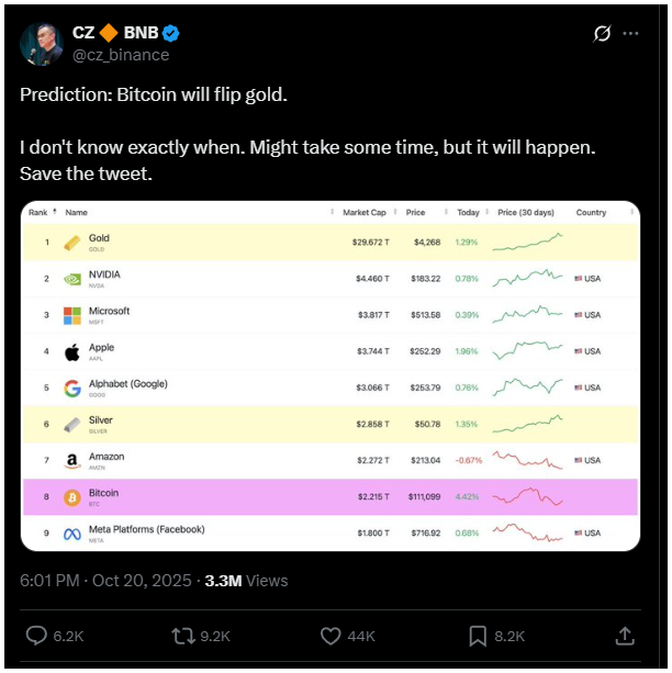 CZ szerint, miközben a BTC az 111.000 dolláros tartományban próbálta tartani magát, az arany 4346 dollár körül mozgott – így a Bitcoin továbbra is alulértékelt az aranyhoz képest.