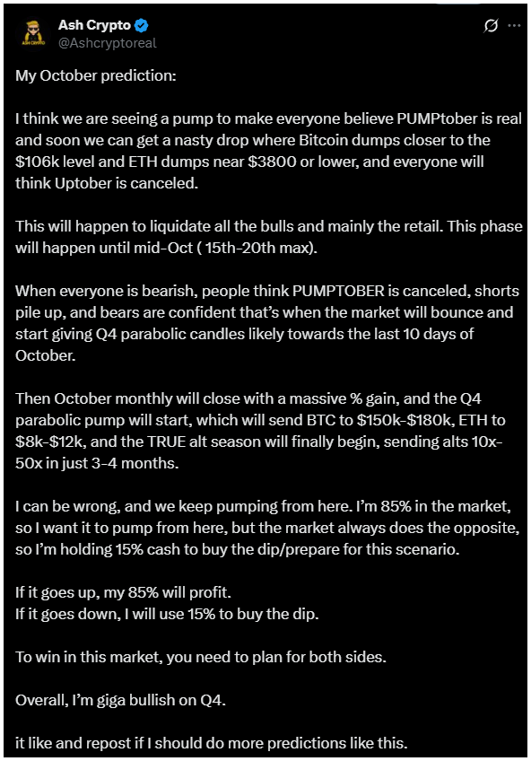 Ash szerint október első fele megtévesztő lehet: a piac könnyen elhitetheti, hogy a „PUMPtober” már elindult.