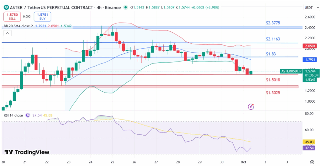 A grafikonokat vizsgálva az ASTER árfolyama élesen beesett a 7 napos mozgóátlag (SMA) 1,93 dollár és a 1,70 dolláros pivotpont alá – ezek most szilárd ellenállássá váltak.