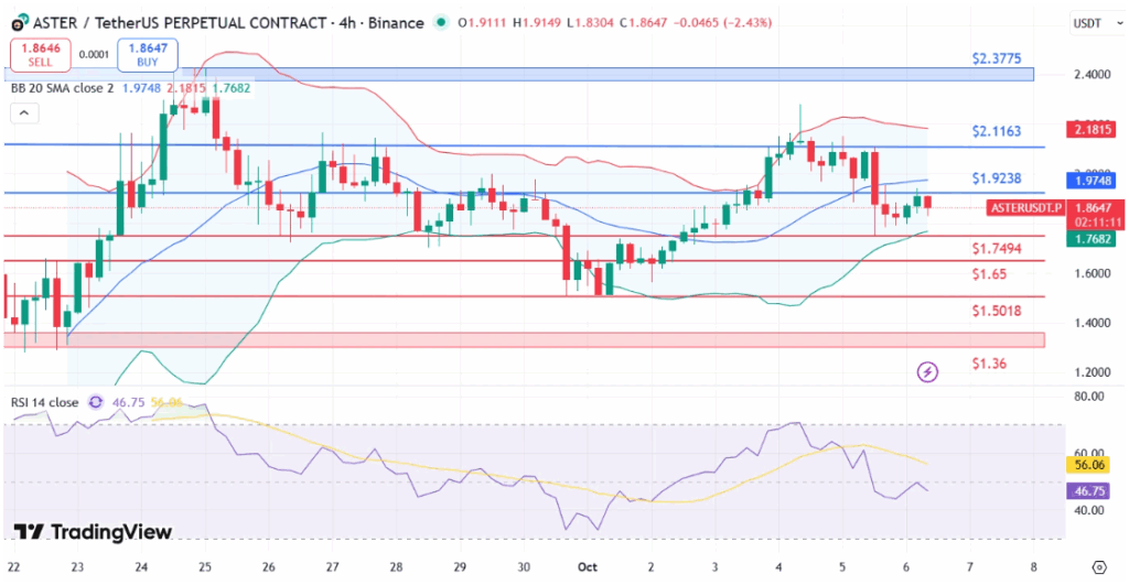 Ahogy közeledik október 14, az Aster kritikus ponthoz érkezett. Az árfolyam mindössze 24 óra alatt 10,22%-ot esett, jelenleg 1,83 dolláron forogva, miután áttörte a kulcsfontosságú támaszszinteket.