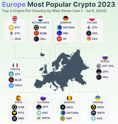 De vajon milyen kriptók a legnépszerűbbek a környezetünkben? Lengyelországban a felmérés időszakában (2023 január 1- 2023 július 29) például az ETH volt a legmenőbb, míg Szlovéniában az OPTI, Romániában az EGLD, és Ukrajnában az APEX.