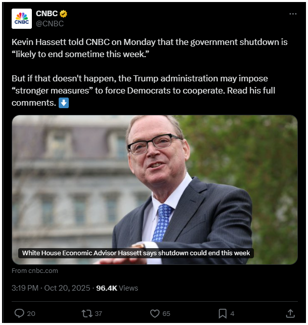 Kevin Hassett, a Fehér Ház gazdasági tanácsadója arról beszélt, hogy a „Schumer-leállás” (ahogy a republikánusok hívják, utalva Chuck Schumer szenátusi vezetőre) napjai meg vannak számlálva.