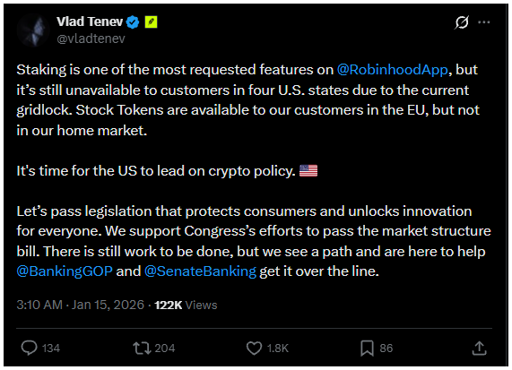 A közösségi médiában Tenev elmondta, hogy a staking továbbra is az egyik legnépszerűbb funkció a Robinhood felhasználói körében.