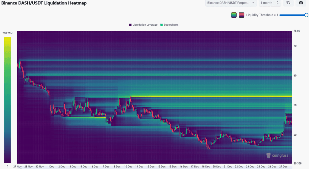 Ezért valószínű, hogy a DASH a 53 dolláros likviditási zóna felé mozdul. Az áttörés azonban nem biztos, hogy azonnal bekövetkezik.