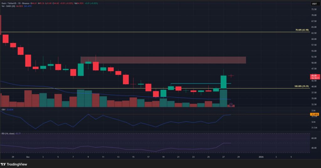 Az egynapos grafikonon emelkedő trendváltás látszott a Dash esetében. Ez akkor történt, amikor december 27-én, szombaton áttörte a 41,27 dolláros korábbi csúcsot.