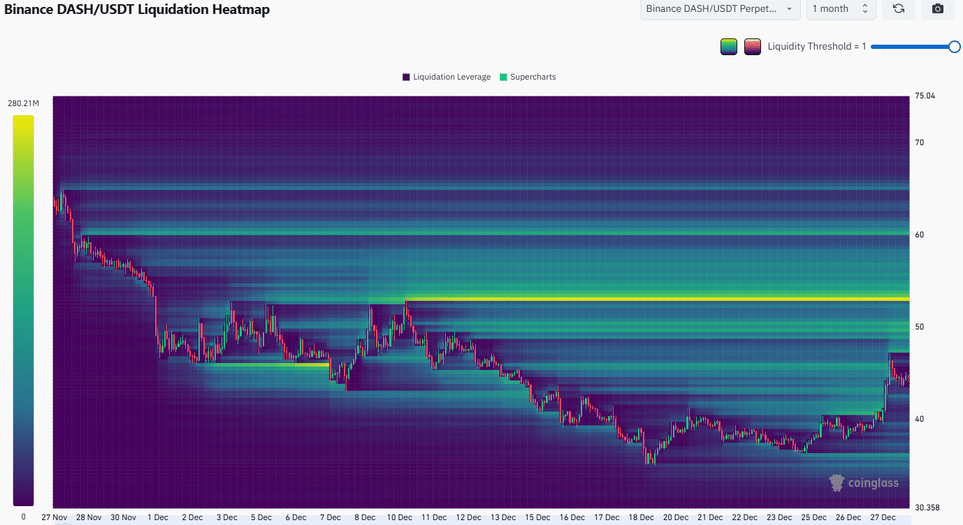 A Dash egyhónapos visszatekintése szerint a likvidálási szintek főként 53 dollár körül összpontosultak.