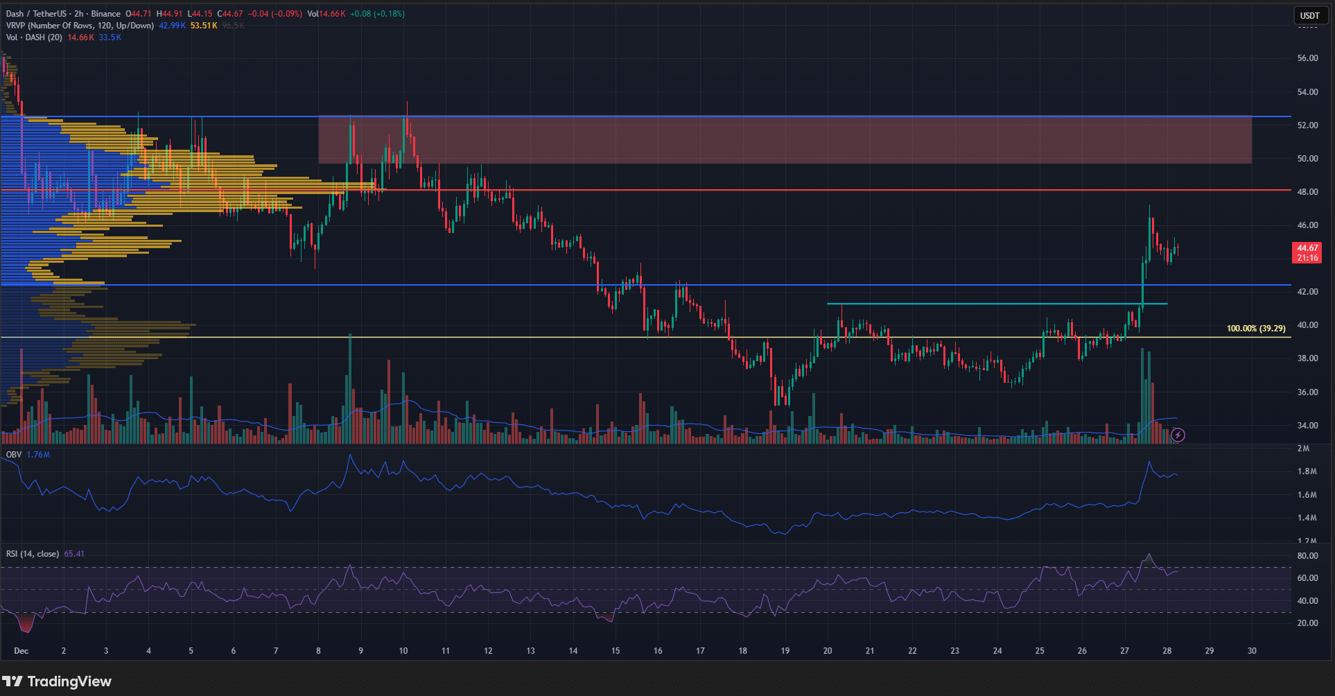 Az egynapos grafikonon emelkedő trendváltás látszott a Dash esetében. Ez akkor történt, amikor december 27-én, szombaton áttörte a 41,27 dolláros korábbi csúcsot.