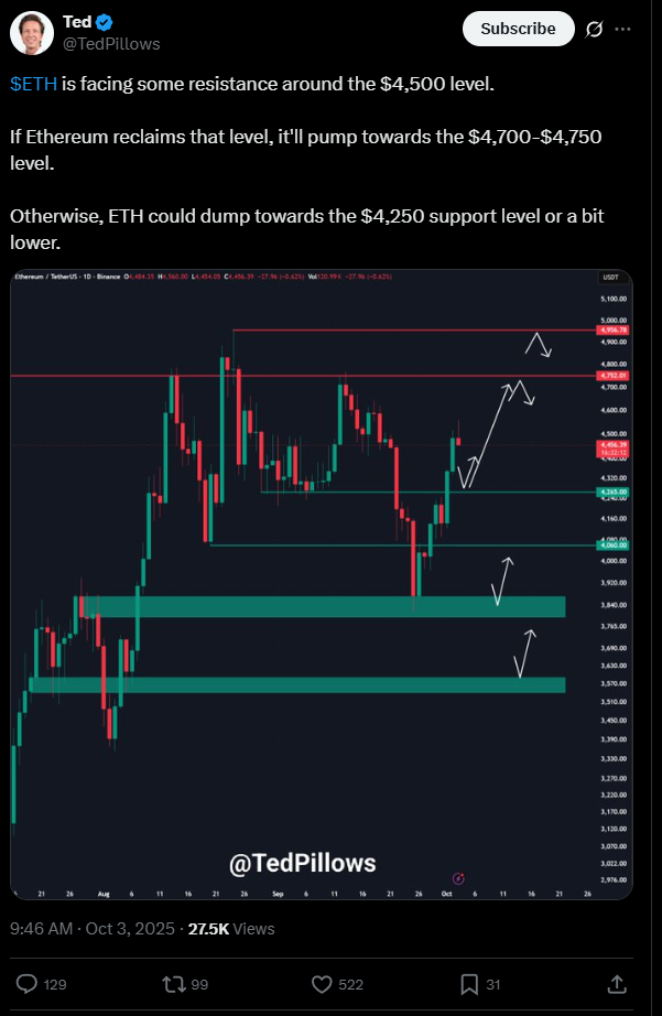 Az ő elemzése szerint, ha sikerül visszahódítani ezt a szintet, az árfolyam gyorsan a 4700–4750 dolláros tartomány felé törhet.