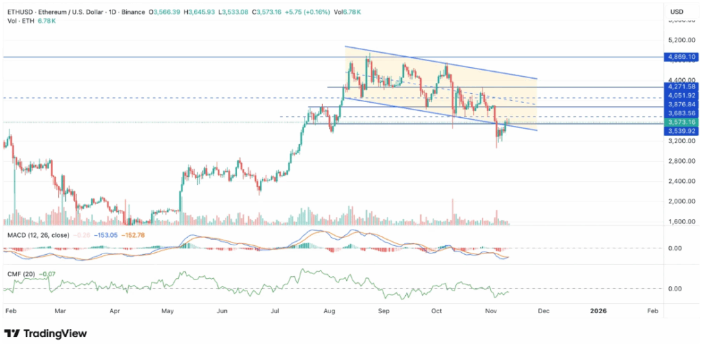 A legutóbbi korrekció során az ETH átmenetileg letört a csökkenő trendcsatornából, de gyorsan visszatért, ami a bikák erejét mutatja.