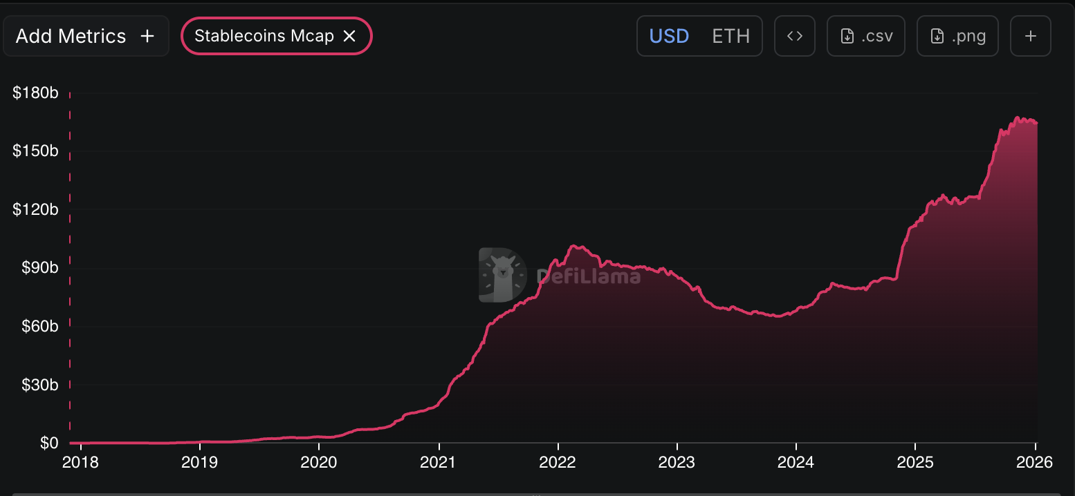 Az Ethereumon a stablecoinok teljes piaci kapitalizációja meghaladja a 163,9 milliárd dollárt.