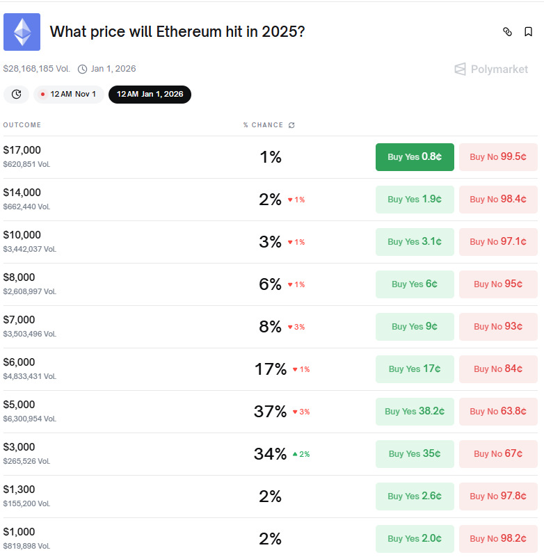 A jelenlegi Polymarket adatok szerint 37% az esélye annak, hogy az $ETH eléri az 5000 dollárt 2025-ben, és 34% az esélye annak is, hogy visszaesik 3000 dollárra.