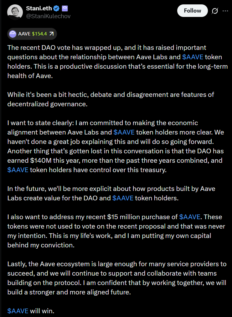 Az Aave Labs alapítója, Stani Kulechov cáfolta a híreket, miszerint 15 millió dollár értékben vásárolt volna AAVE tokent, hogy befolyásolja a legutóbbi, sikertelen irányítási szavazást.