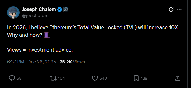 Az Ethereum TVL-je akár „tízszeresére” is nőhet 2026-ban