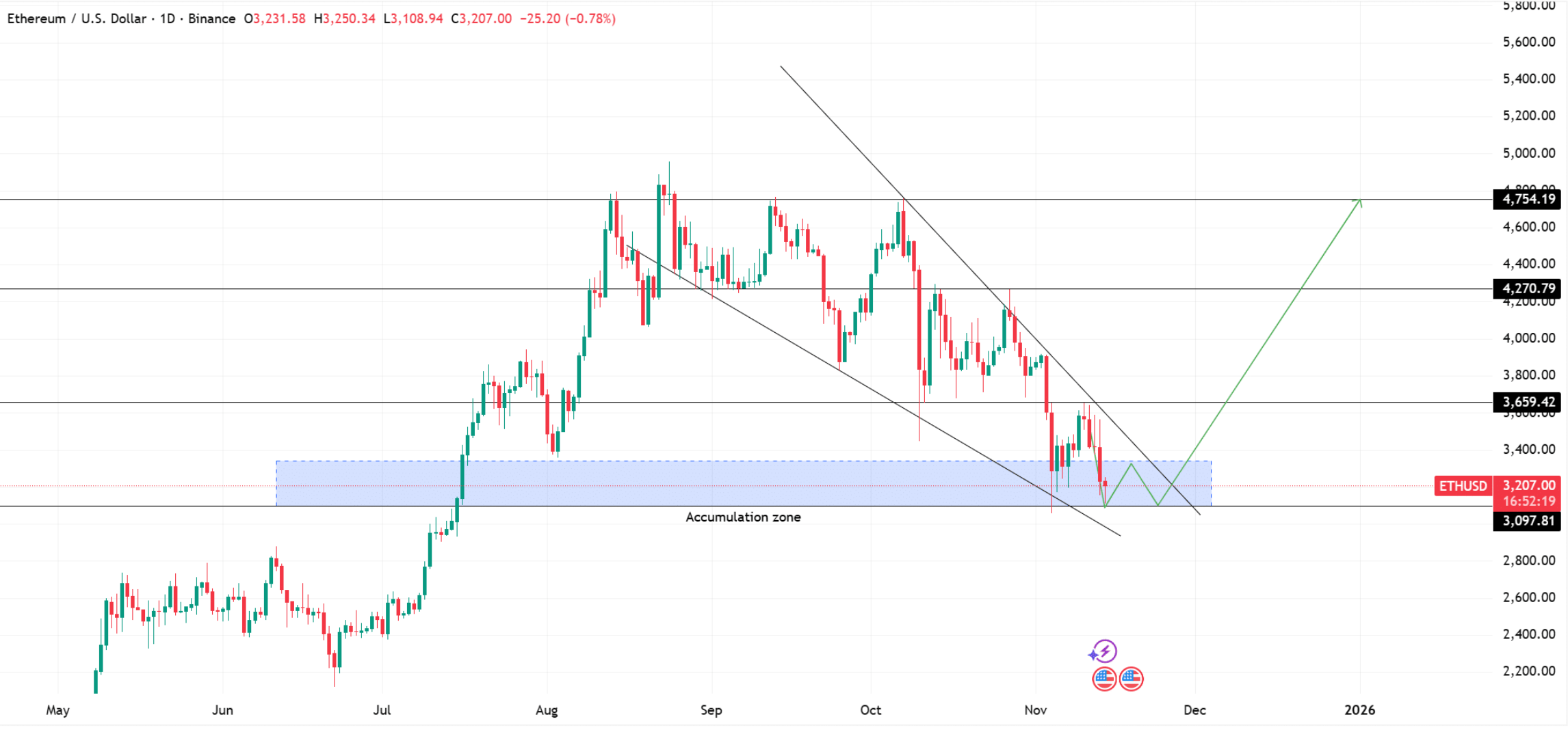 Mégis, a vevők minden egyes alkalommal megvédték a kulcsfontosságú 3097–3200 dolláros tartományt — ez a zóna továbbra is az ETH stratégiai felhalmozási területe.
