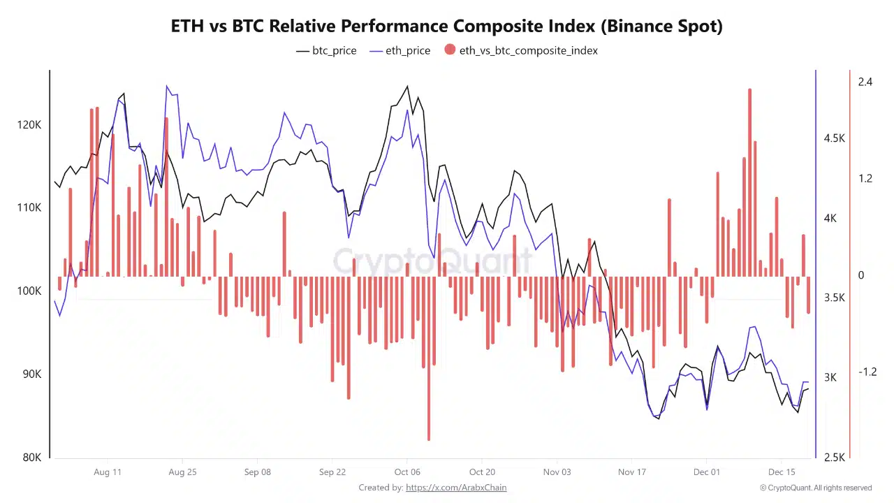 Ennek ellenére az Ethereum továbbra is lemarad a BTC mögött. A Binance adatai szerint az ETH–BTC összetett mutató cikkünk írásakor körülbelül -0,46 volt, jóval nulla alatt.