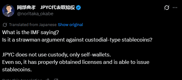 Noritaka Okabe, a JPYC Co. vezérigazgatója, azonban nem értett egyet az IMF „issuer control” kijelentésével. A JPYC Co. Japán első szabályozott, jen alapú stablecoinja, amelyet fizetésekre és DeFi célokra használnak.