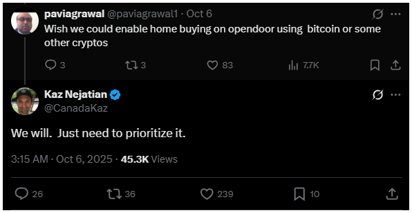 A hírt Kaz Nejatian, az Opendoor vezérigazgatója dobta be az X-en, és nem is akárhogy, szerinte nemcsak a bitcoin, de más kriptó is fizetőeszközként jelenhet meg a platformon.