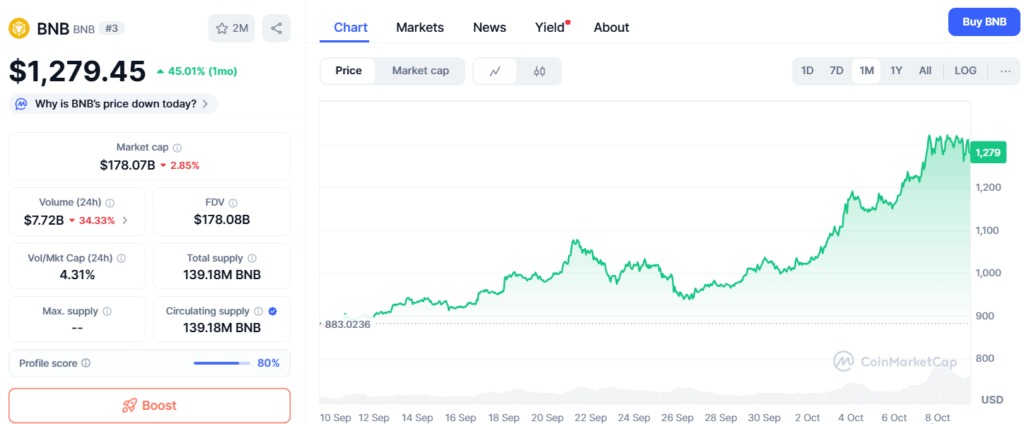 A $BNB az elmúlt 1 hónap során 45,01%-os árfolyamemelkedéssel kedden elérte új csúcsát, az 1,336.57 dollárt.