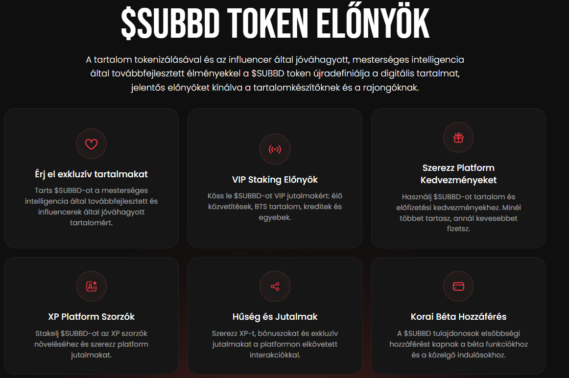 Ha rajongó vagy, a $SUBBD tokenjeid számának növekedésével prémium tartalmakhoz juthatsz hozzá, küldhetsz borravalót, kérhetsz személyre szabott tartalmat, és kedvezményeket kapsz.