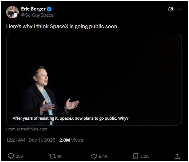 A történet egy látszólag egyszerű reakcióval kezdődött. Amikor egy űripari újságíró arról írt, hogy a SpaceX hamarosan tőzsdére mehet, Musk röviden csak annyit válaszolt: „mint mindig, most is pontos”.