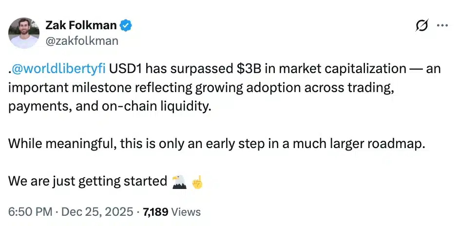 A World Liberty Financial által létrehozott USD1 stablecoin piaci értéke átlépte a 3 milliárd dollárt.