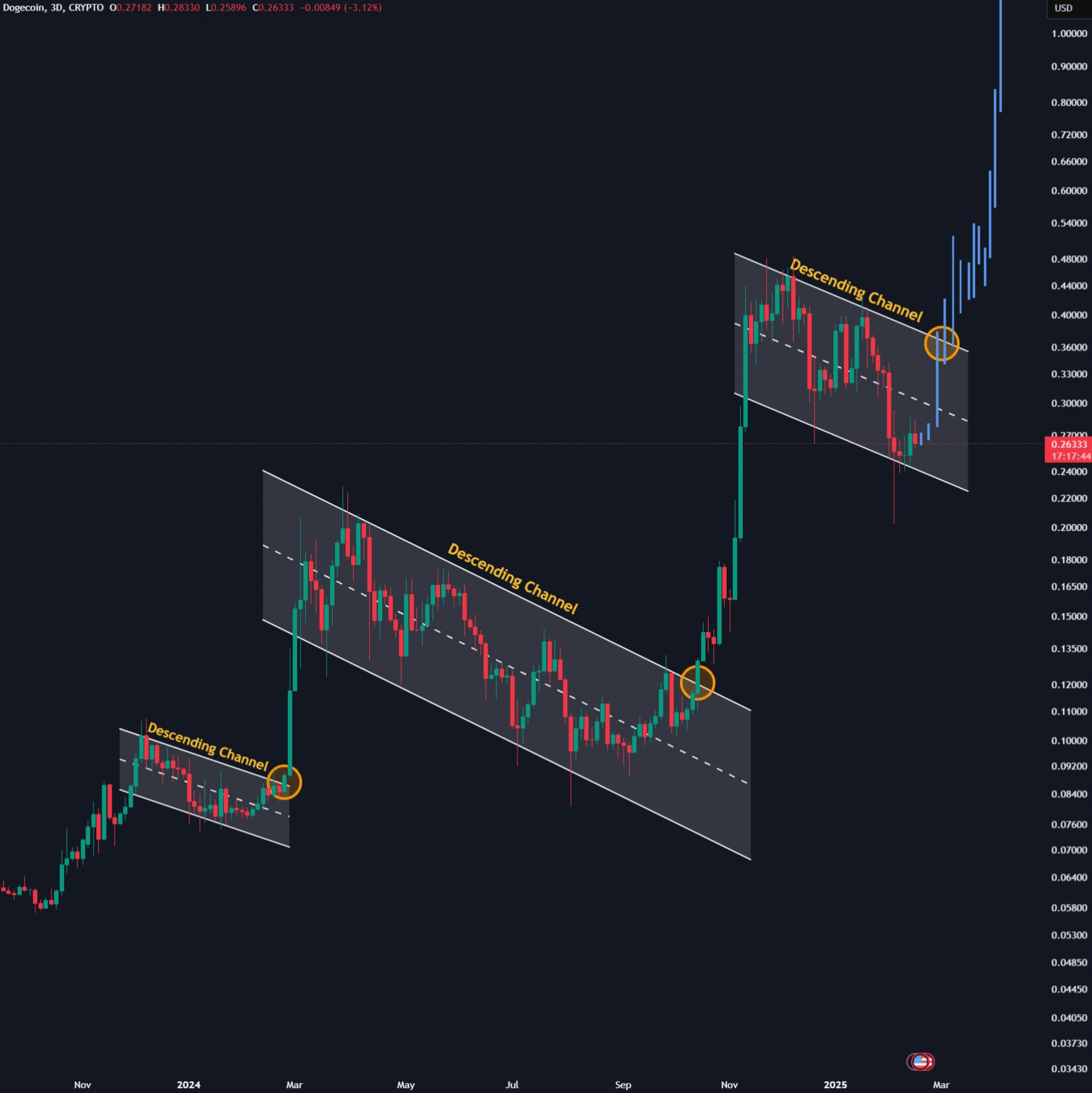 A Dogecoin egy bikás csökkenő csatornában mozgott, egy olyan mintázatban, amelyet 2023 végén és 2024 közepén is láthattunk.