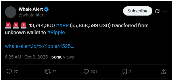 Október 6-án a Whale Alert blokkláncfigyelő jelentette, hogy 18,7 millió XRP-t (kb. 55,8 millió dollár) utaltak át egy ismeretlen tárcából egy Ripple-címhez kötött pénztárcába.